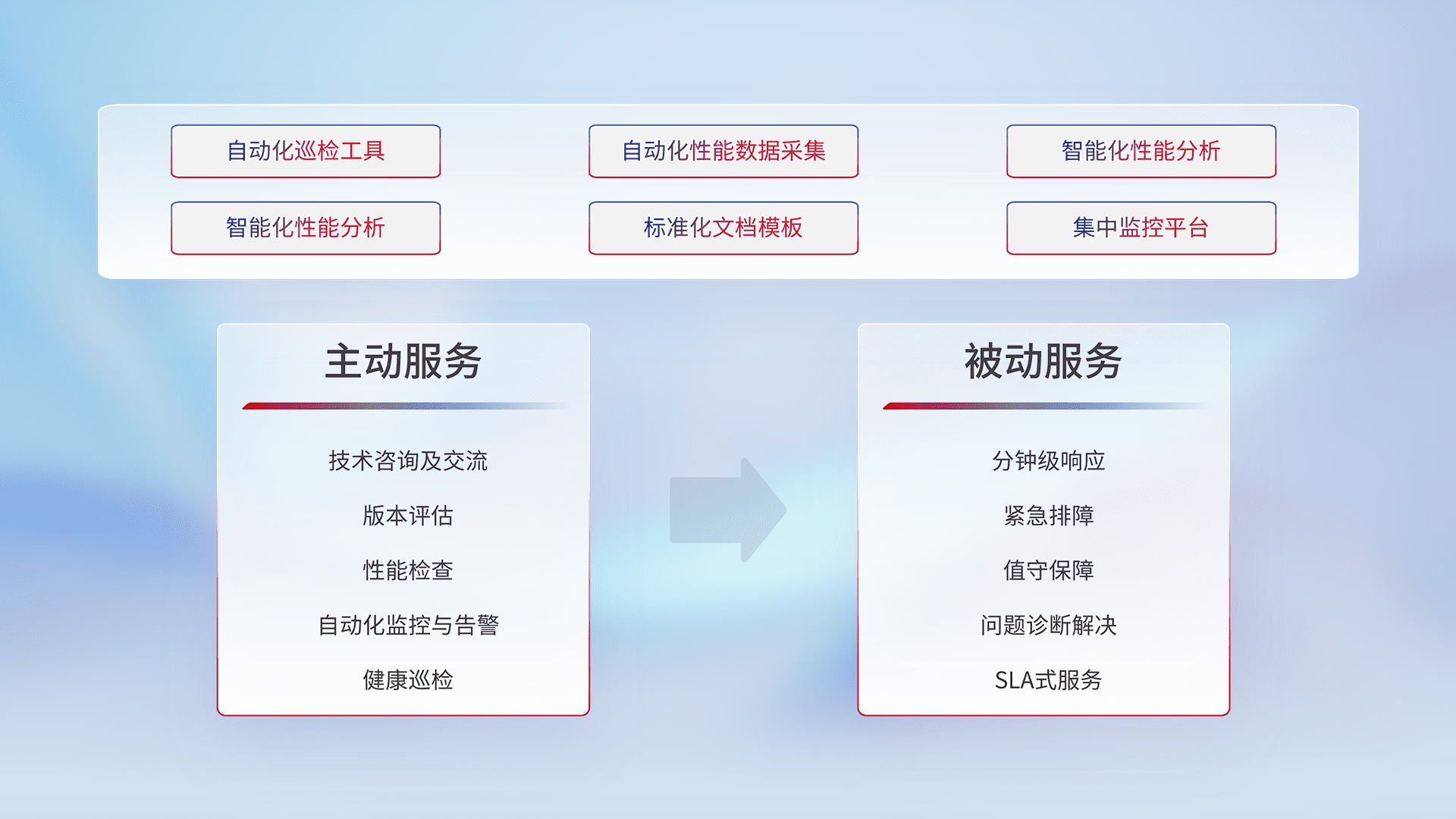 智能化工具和标准化文档,,,,保障服务质量,,,,提供主动服务(包含技术咨询、、、版本评估、、、性能检查、、自动化监控与告警、、、、健康巡检)和被动服务包含(分钟级响应、、紧急排障、、、、值守保障、、问题诊断解决、、SLA服务)。。。。